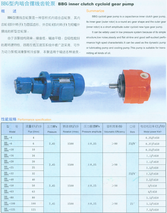 BB型BBG型擺線齒輪泵是一種容積式內(nèi)齒輪泵,其內(nèi)齒輪(即外轉(zhuǎn)子)為圓弧齒形,外齒輪(即內(nèi)轉(zhuǎn)子)為短幅外擺線的齒輪泵。由于該泵結(jié)構(gòu)簡(jiǎn)單、噪音低、輸油平穩(wěn)、自吸性能好的高轉(zhuǎn)速特性,因而在低壓液壓系統(tǒng)中被廣泛采用,可作為動(dòng)力泵或潤(rùn)滑泵各冷卻泵,本泵適用于輸送各種油類。